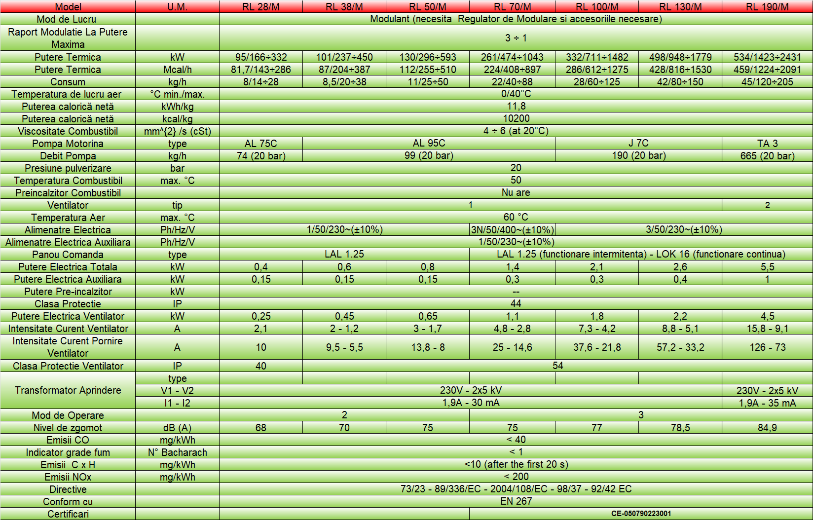Arzatoarele pe motorina din seria RL/M sunt arzatoare monobloc, automatizate, alimentare electrica trifazata (cu exceptia modelului RIELLO 28/M care este monofazat), functionare progresiva cu posibilitate de modulare prin intermediu regulatorului de modulatie RWF 40.