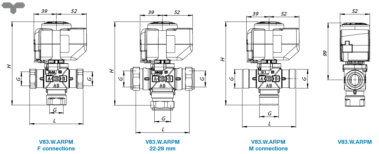 - 3 căi: actuator pe B, vană cu calea AB-B deschisă
